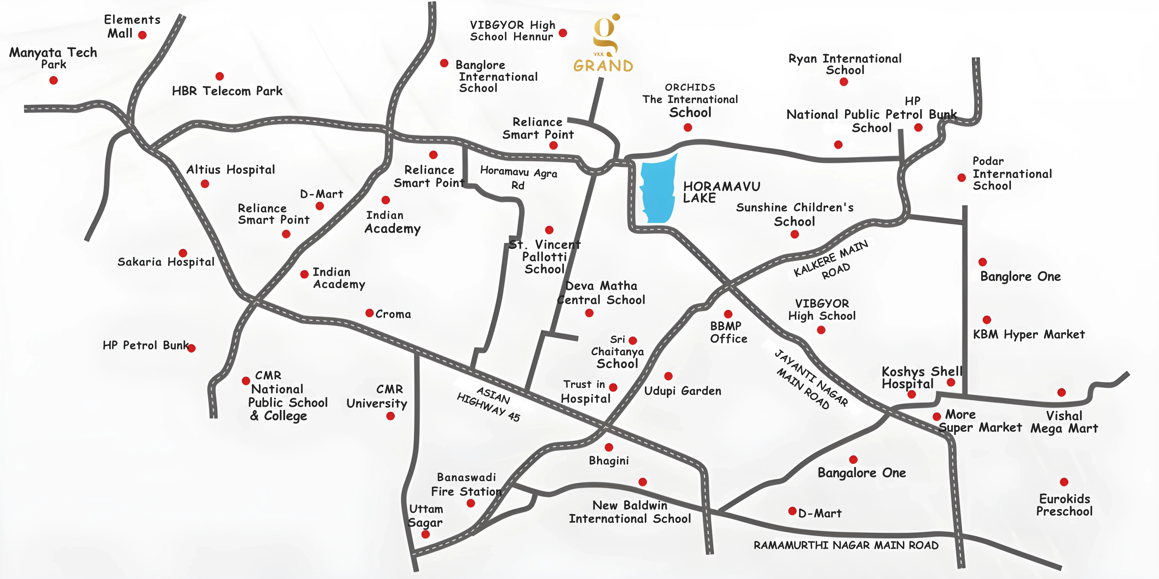 VKK Grand is strategically located in Horamavu near Manyata Tech Park, Bangalore, offering excellent connectivity to IT hubs, schools, hospitals, and shopping destinations.